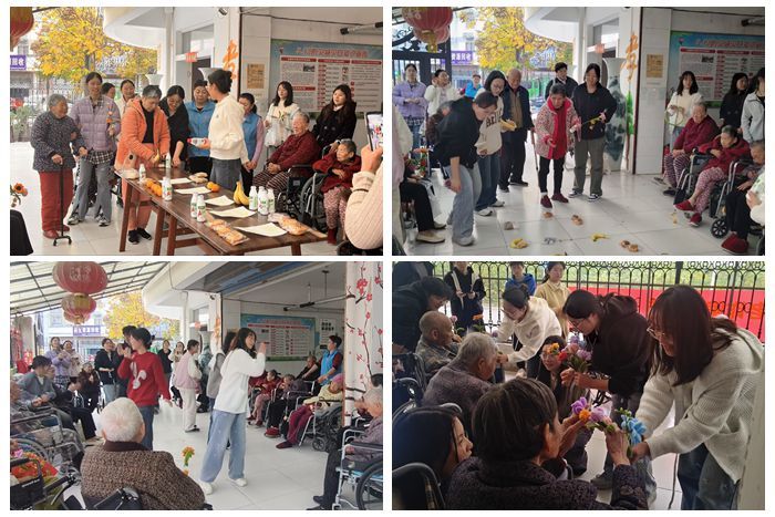 趣味互动,笑语不断。随后的滚水瓶、抢水杯、套圈等趣味游戏,将现场气氛推向高潮。老人们踊跃参与,仿佛重回童年时光,脸上绽放出灿烂的笑容;志愿者们则细心搀扶、耐心讲解,并不时送上鼓励的掌声。思政委员们为参与活动的老人准备了小奖品,每一份都承载着学子们浓浓的敬意与真挚的祝福。