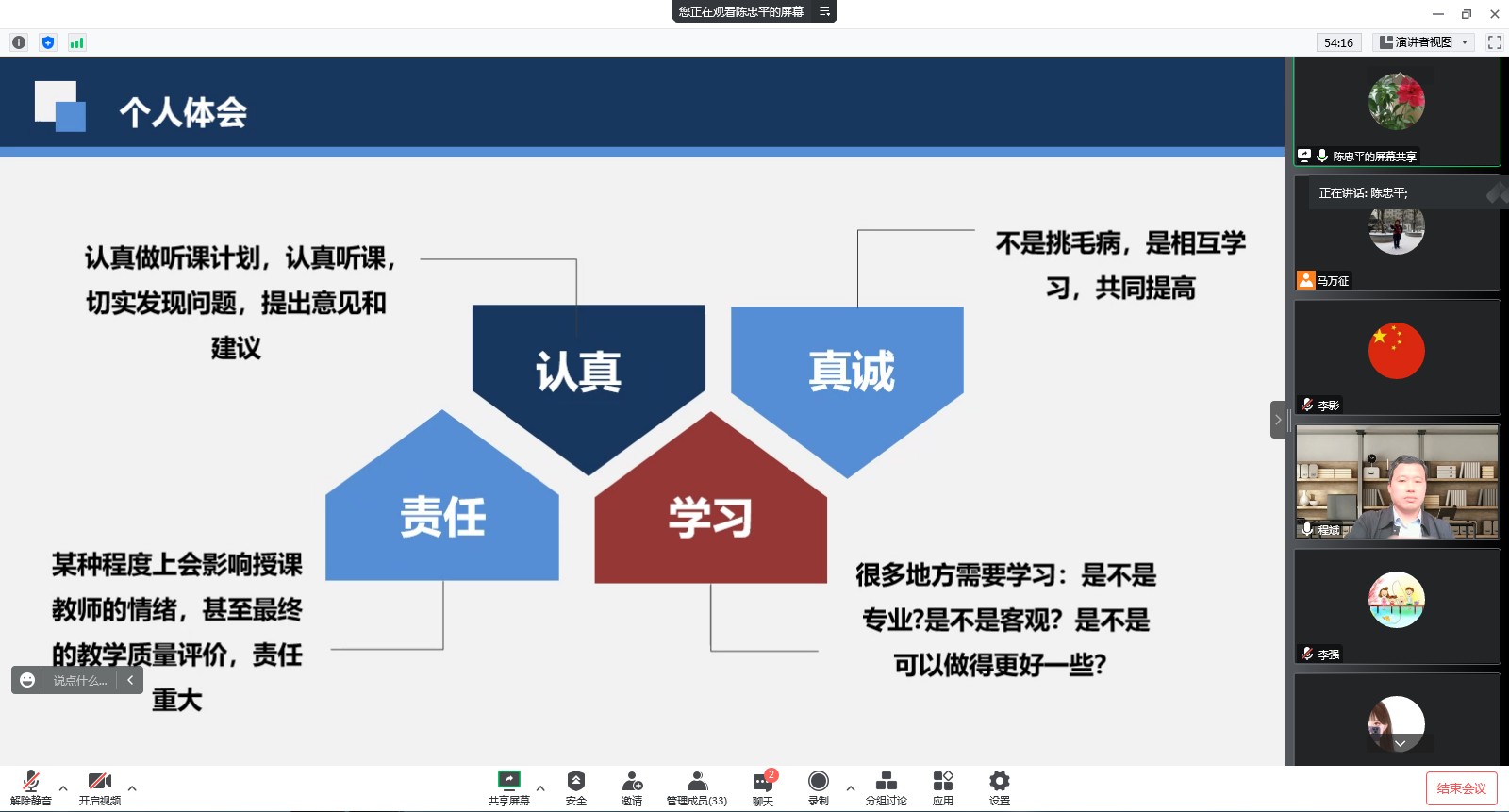 根据会议安排,校教学督导员李影老师、陈忠平老师,财经学院督导组长李强老师,分别分享了学习培训成果,工作体会和创新做法,并提出了工作建议。自由研讨环节,与会人员围绕精准督导、有效督导和创新督导,各抒己见,汇集了智慧,拓展了思路。