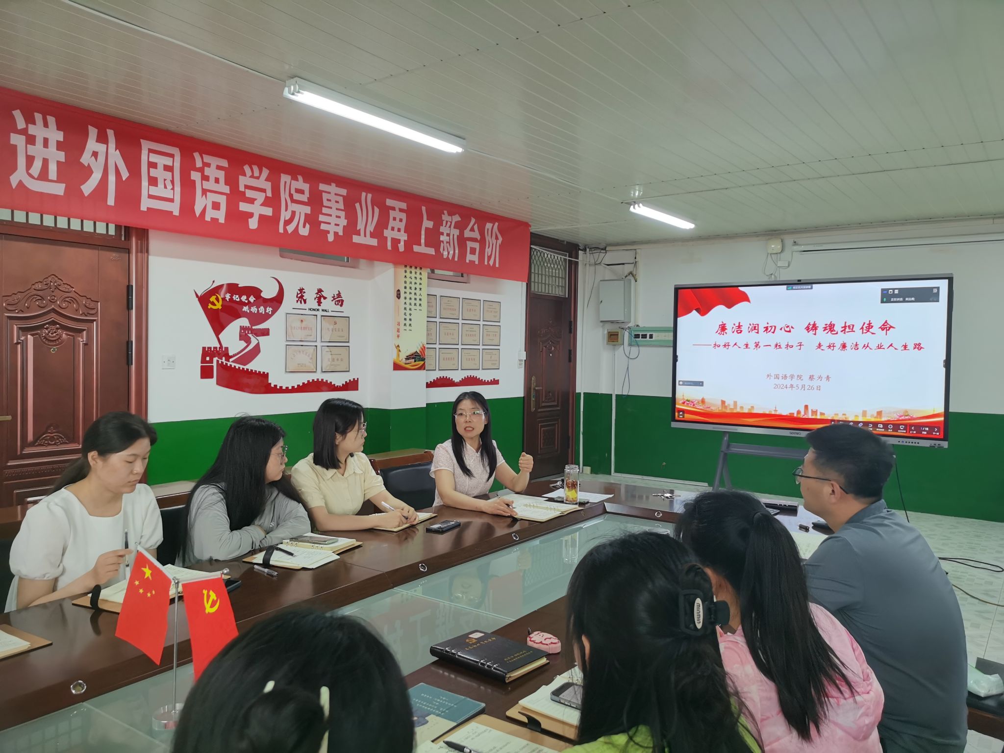 为进一步加强毕业生党员党性教育,打好廉洁从业的“预防针”,5月26日,外国语学院在学院会议室开展2024届毕业生党员廉洁入职专题党课。党课由学院党委书记蔡为青主讲,学院有关教师、全体毕业生党员共同聆听党课。