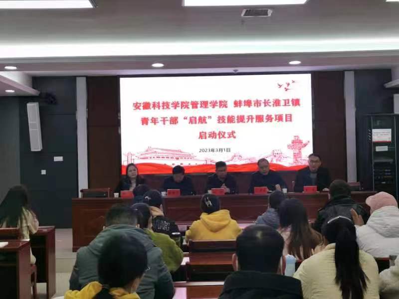 为更好地服务地方经济社会发展,助力推进乡村振兴,全面提升基层干部能力素质,经过与蚌埠市长淮卫镇多次协商,我校管理学院为长淮卫镇量身打造的青年干部“启航”技能提升服务项目启动仪式于3月1号上午在龙湖校区西辅楼111会议厅如期举行。市经开区党工委委员、管委会副主任、长淮卫镇党委书记赵斌,长淮卫镇党委副书记王奎,管理学院党委书记丁景良、院长陈传万、副院长郑谦出席启动仪式。启动仪式由丁景良主持。