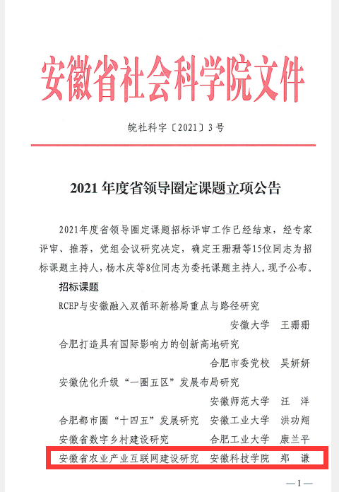 近日,安徽省社会科学院发布2021年度省领导圈定课题立项公告,管理学院郑谦博士主持的“安徽省农业产业互联网建设研究”项目获批立项。