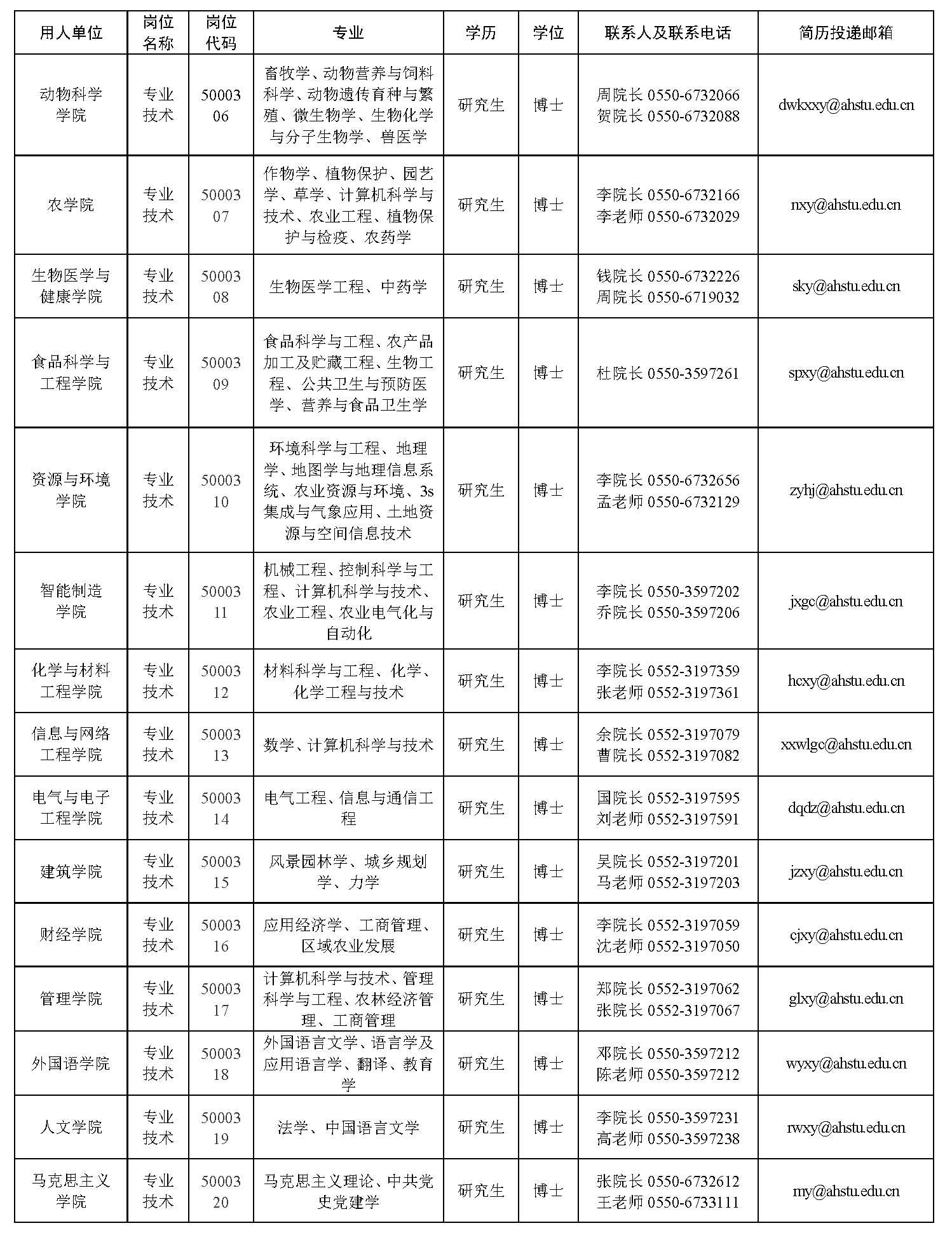 三、招聘条件 (一)基本条件 招聘对象除符合招聘岗位条件外,还必须符合以下基本条件: 1、具有中华人民共和国国籍; 2、遵守宪法和法律,热爱祖国,热爱教育事业; 3、遵守职业道德和学术规范,作风正派,品行端正; 4、善于团结协作,责任心强; 5、适应岗位要求的身心条件; 6、无违法违纪及不良记录。 (二)年龄要求 博士研究生40周岁以下(1985年1月1日(含)以后出生,以下类推),具有博士学位副高级职称人员45周岁以下,具有博士学位正高级职称人员50周岁以下,符合《安徽省高层次人才分级分类目录》认定A、B、C类条件的人员及特别优秀人员年龄可适当放宽。 (三)科研要求 各类人才科研业绩要求详见《安博站·官方版网站登录入口2025年人才引进办法》。 (四)教学要求 具备高校教师应有的基本素质和教育教学能力。有下列情形之一的人员,不得报考: (一)不符合岗位招聘条件的人员; (二)在读的全日制普通高校非应届毕业生; (三)现役军人; (四)在各级各类事业单位公开招聘中因违反《事业单位公开招聘违纪违规行为处理规定》被记入事业单位公开招聘应聘人员诚信档案库,且记录期限未满的人员; (五)曾因犯罪受过刑事处罚的人员和曾被开除公职的人员、受到党纪政纪处分期限未满或者正在接受纪律审查的人员、处于刑事处罚期间或者正在接受司法调查尚未作出结论的人员; (六)按照国家、省有关规定,尚在最低服务年限内的机关、事业单位正式在编工作人员; (七)法律法规规定不得参加报考或聘用为事业单位工作人员的其他情形人员。 报考者不得报考聘用后即构成《事业单位人事管理回避规定》第六条所列情形的岗位。 四、报名 请对照我校2025年招聘计划,向所在用人单位(简历投递邮箱见招聘计划)以附件形式投递应聘简历。 五、资格初审 收到应聘人员投递的报名材料后,相关用人单位对应聘人员材料进行资格审查,对符合岗位需求的人员,通知其来校参加考核。 六、考试考核 由用人单位负责,采用笔试、试讲、科研水平和实践技能相结合的方式进行。 七、成绩合成 按照笔试、试讲、科研水平相结合的方式进行考核的,成绩分别按2:4:4比例加权后确定总得分;按照笔试、试讲、科研水平、实践技能相结合的方式进行考核的,成绩分别按2:3:3:2比例加权后确定总得分。 八、体检和考察 体检工作按照人力资源和社会保障部、国家卫生计生委、国家公务员局《关于修订〈公务员录用体检通用标准(试行)〉及〈公务员录用体检操作手册(试行)〉有关内容的通知》(人社部发〔2016〕140号)和省委组织部、省人力资源和社会保障厅、省卫生厅《关于进一步规范全省事业单位公开招聘人员体检工作的通知》(皖人社秘〔2013〕208号)等有关规定执行。 考察工作根据拟聘用岗位要求,采取多种形式,全面了解掌握考察对象在政治思想、道德品质、能力素质、遵纪守法、廉洁自律、岗位匹配等方面的情况以及学习工作和报考期间的表现,核实考察对象是否符合规定的报考资格条件,提供的报考信息和相关材料是否真实、准确,是否具有报考回避的情形等方面的情况。 根据《关于加快推进失信被执行人信用监督、警示和惩戒机制建设的实施意见》(皖办发〔2017〕24号)等文件精神,考察结束时考察对象仍属于失信被执行人的,考察环节不予合格。 九、公示 对体检、考察均合格的拟聘用人员,学校研究通过后,在学校网站进行公示,公示期为5个工作日。 十、签约聘用 经公示无异议或公示结果不影响聘用的,由学校按照规定将有关材料报送省人力资源和社会保障厅办理有关聘用手续。对违反公开招聘规定或未能在2025年12月31日前提供招聘岗位所要求的相应层次的学历、学位等证书的报考人员,取消其聘用资格。 根据《事业单位人事管理条例》(国务院令第652号)规定,事业单位新进人员实行聘用制,须与招聘单位签订聘用合同,并按规定实行试用期,试用期包括在聘用合同期限内。试用期满合格的,予以正式聘用;不合格的,取消聘用。 十一、人才引进待遇 详见《安博站·官方版网站登录入口2025年人才引进办法》。 十二、其他事项 (一)招聘工作在安博站·官方版网站登录入口纪委的监督下进行,并接受社会及有关部门的监督。 (二)应聘者须严格对照招聘条件要求投递简历,对不符合学校招聘条件要求的人员一律不予聘用。资格审查贯穿于招聘工作全过程,如在招聘过程中任何环节发现应聘者有违纪违规、材料不齐、提供虚假信息或应聘者条件不符合招聘岗位条件要求等情况的,随时取消应聘资格或解聘。由此造成的后果,由应聘者本人负责。 本《公告》由安博站·官方版网站登录入口人事处负责解释。 咨询电话:0550-6732728 监督电话:0550-6732800 联系人:史老师 谢老师 E-mail: rsc@ahstu.edu.cn 特此公告。 安博站·官方版网站登录入口 2025年4月9日 | |