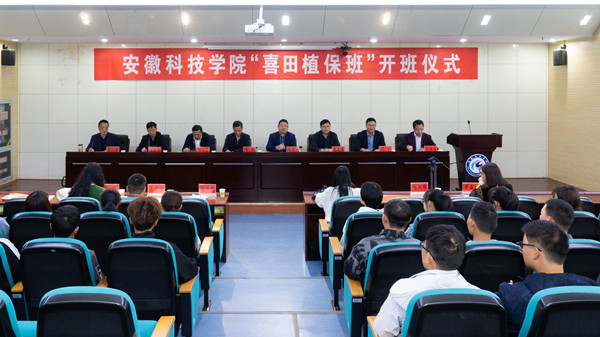 10月13日上午,农学院在会议中心第一报告厅举行“喜田植保班”开班式。校党委副书记、院长李震应邀出席并发表讲话。校党委学工部部长、学生处处长何永勇,校教务处副处长、创新创业学院副院长高青海;安徽喜田生物科技有限公司总经理郭晓刚,副总经理袁国政,销售总监、我校优秀校友、“喜田植保班”校外班主任韩松;《安徽化工信息》《长三角农资》总编辑徐梦云、《三农前线》副编辑潘旭东等出席。农学院党政领导、教师代表、辅导员代表、“喜田植保班”校内班主任、专业班主任和全体学生参加。开班式由农学院党委副书记、院长崔广荣主持。