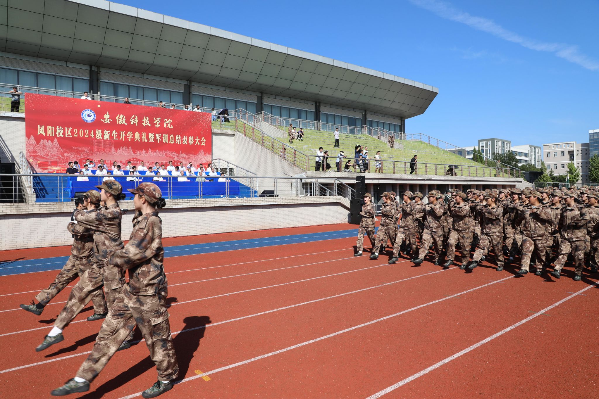9月28日上午,我校凤阳校区2024级新生开学典礼暨军训总结表彰大会在西区田径运动场举行,校党委委员、副院长李升和,党委委员、副院长王孝义,党委委员、副院长赵伟峰,陆军装甲兵学院蚌埠校区中校、凤阳校区军训团团长范晓霄出席大会并在主席台就座。大会由赵伟峰主持。