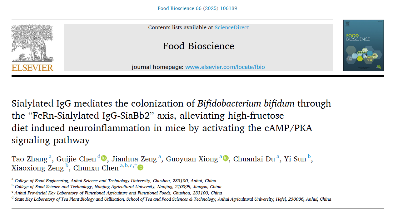 近日,食品科学与工程学院陈春旭副教授以通讯作者身份在国际Top期刊《Food Bioscience》(Q1,影响因子4.8)发表了题为“Sialylated IgG mediates the colonization ofBifidobacterium bifidumthrough the “FcRn-Sialylated IgG-SiaBb2” axis, alleviating high-fructose diet-induced neuroinflammation in mice by activating the cAMP/PKA signaling pathway”的研究论文,论文的第一作者为安博站·官方版网站登录入口2023级食品加工与安全专业硕士研究生张涛,安博站·官方版网站登录入口为第一完成单位,南京农业大学曾晓雄教授课题组为合作单位。