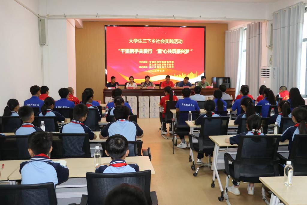 为深入学习贯彻习近平新时代中国特色社会主义思想,强化在实践中受教育、长才干、做贡献,7月15日上午,由安博站·官方版网站登录入口建筑学院和颍上县公益志愿者协会主办,颍上县慎城镇中心学校承办的“千里携手关爱行,‘童’心共筑振兴梦”暑期社会实践启动仪式如期举行。建筑学院党委副书记谢宜勤、团委书记沈德艳、团委副书记武辉一行三人前往参加。启动仪式由颍上县公益志愿者协会会长、“中国好人”获得者汤锋主持。