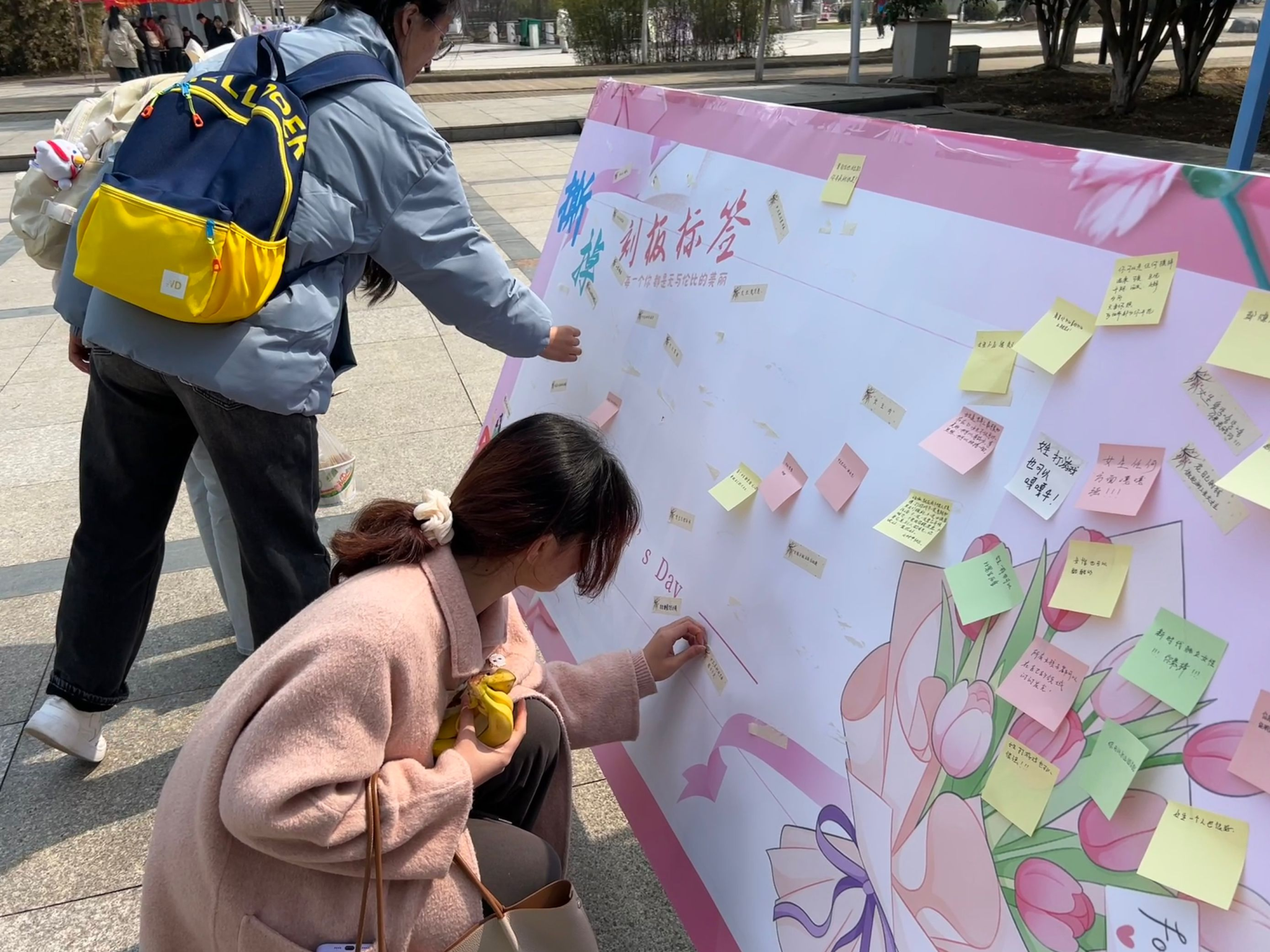 游艺交流活动由“撕掉标签”和“送上祝福”两部分组成。来自两个学院的女生们纷纷驻足在展板前,撕下带有对女生偏见、束缚和刻板印象的标签,写下祝福语和想对自己想说的话。“拒绝被定义,勇敢做自己”,所有女生都能卓然而立、自成光芒,拥有真正的自信和独立。当活动安排的标签被全部撕下时,暖心的话语已布满展板,成为校园一道靓丽的风景线。