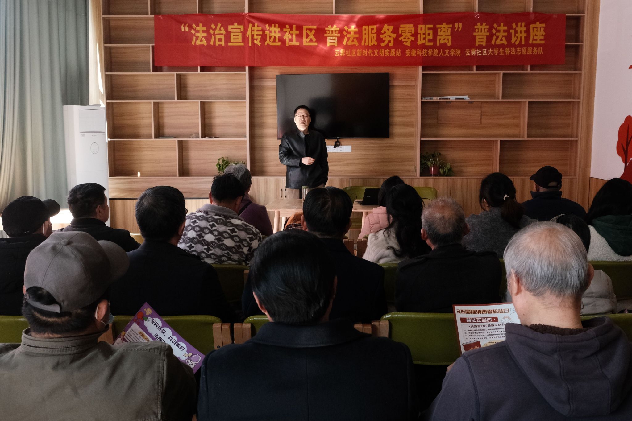 为深入学习宣传贯彻习近平法治思想,践行依法治国理念,增强群众法治意识与维权意识,充分发挥居民社区与高等学校共建法治社会的示范引领作用,3月15日上午,人文学院熠辉学生党员工作室赴凤阳县府城镇中都街道云霁社区,开展以“法治宣传进社区,普法服务零距离”为主题的普法宣传进社区活动。人文学院法学系副教授杨俊、党政办副主任方明旺,云霁社区党支部书记薄明号,熠辉学生党员工作室部分成员和社区居民参加此次活动。