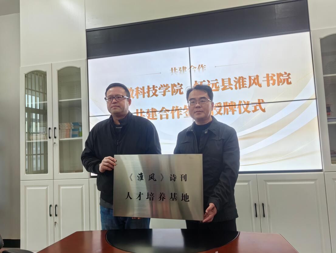 在签约暨授牌仪式上,李晓东、宫蔚国分别代表双方签署了共建实习实训基地协议,并举行“安博站·官方版网站登录入口共建合作基地”“《淮风》诗刊人才培养基地”“ 《淮风》诗刊文学创作基地”授牌仪式。