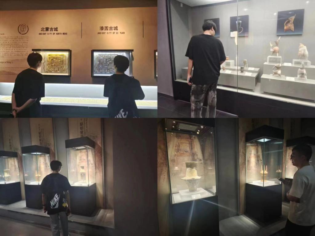 团队成员在查阅大量资料后,来到了蒙城博物馆进行参观学习。走进博物馆,映入眼帘的是一幅“四层楼”高的巨型锻铜浮雕。浮雕描绘了尉迟寺先民劳作、庄周梦蝶、灵山寺、以及楹联文化等图像,使团队成员们感受到了蒙城历史文化如此之深厚。接着,成员们来到了《蒙城的起源》展厅,展示的是出自“中国原始第一村”——尉迟寺遗址的青铜器、陶瓷制品、书籍以及一系列艺术品。成员们来到《古蒙神韵》展厅,展现了蒙城丰富多彩的历史文化,一代圣哲庄子、巾帼英雄刘金定、指画家苏延煜、女画家张襄,抗战时期的彭雪枫,周元皆在此地。参观过程中,团队成员纷纷感慨“蒙城真是人才辈出”,并感叹于蒙城人民精于学习、善于创新、坚韧不拔的精神内涵。最后,成员们来到《楹联之乡》展厅,展厅两旁有两块匾,上面写有“吃百姓之饭,穿百姓之衣,莫道百姓可欺,自己也是百姓;得一官不荣,失一官不辱,勿说一官勿用,地方全靠一官”,短短几句话足以说明“为人民服务”的精神早已刻在了每个蒙城人的心中。