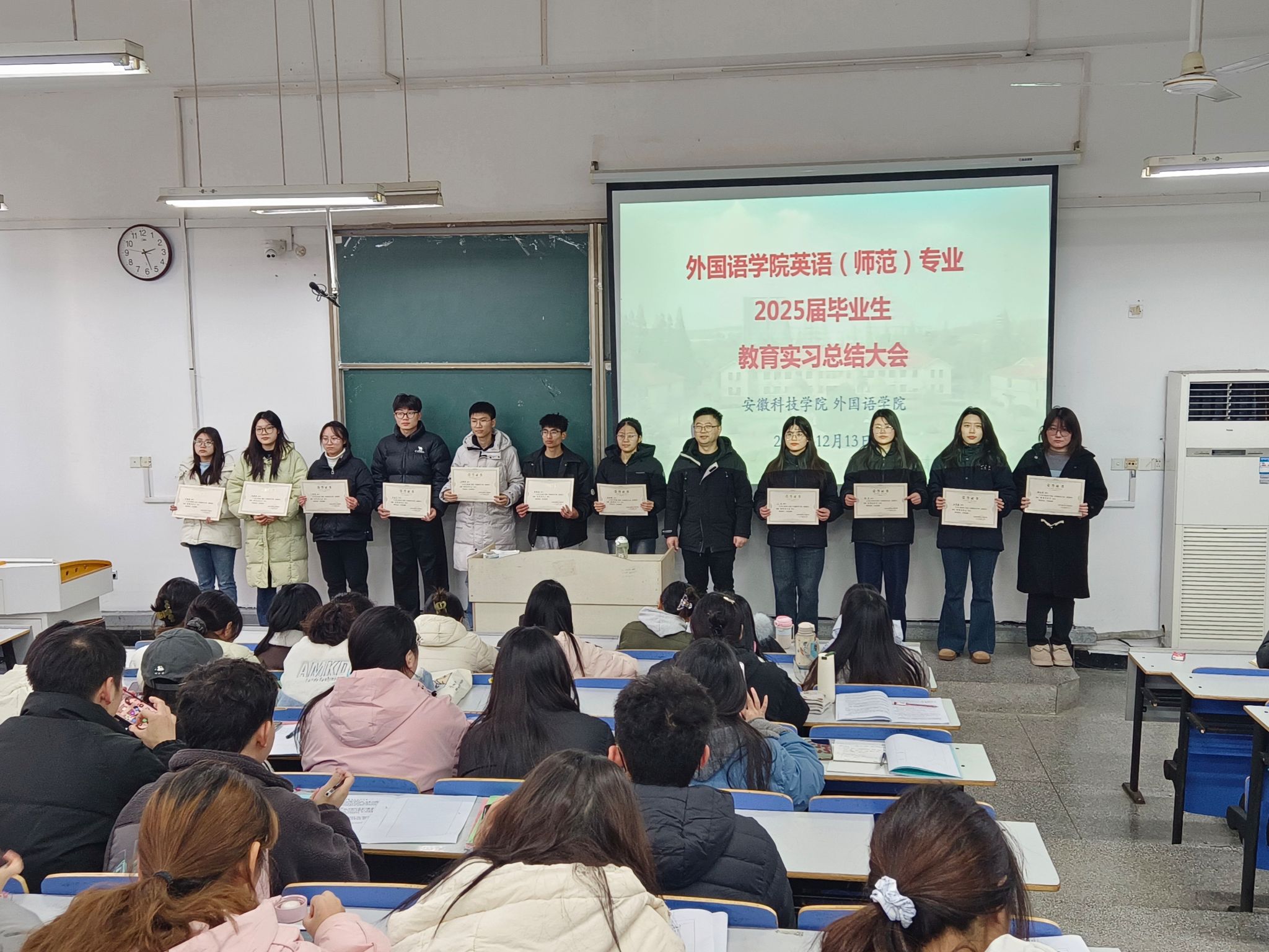 12月13日下午,外国语学院在求知楼A106教室召开2025届英语(师范)专业毕业生教育实习总结大会。外国语学院党委副书记张海亮、副院长洪民、英语教研室主任王祥德、英语专业负责人汪愫苇、指导教师代表和2021级英语(师范)专业全体实习生参加本次会议。会议由洪民主持。
