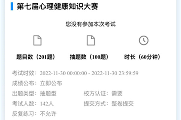 本次选拔赛面向2022级全体学生,以线上考试的形式进行,答题时间为60分钟,考题从院心联自编题库中随机抽取100道题。题库中的题目密切结合大学生在学校生活可能遇到的问题和情景,着重考察了学生对心理知识的掌握和自我心理的调控和支配能力。