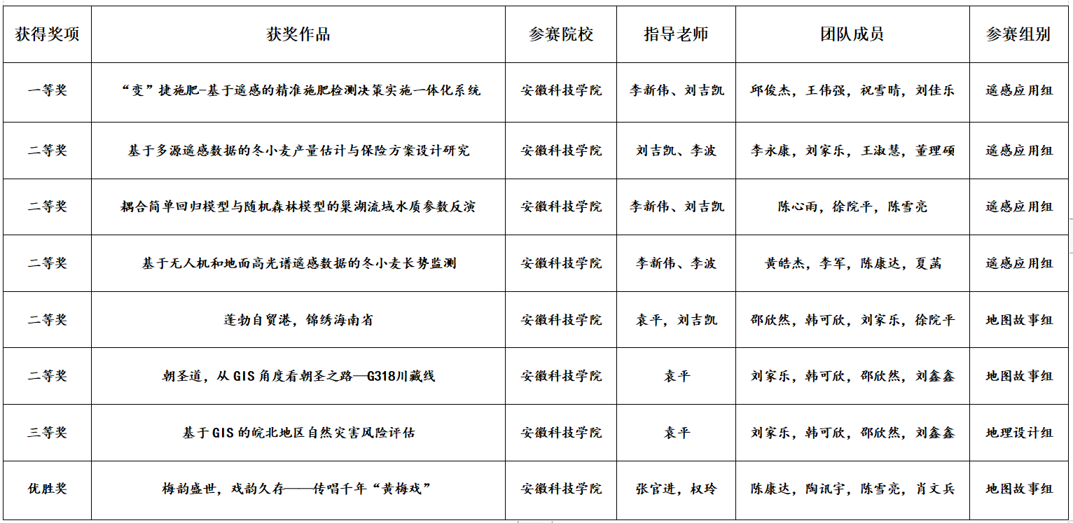 本次GIS开发竞赛分为(A组)地图故事组、(B组)地理设计组、(C组)GIS应用开发组和(D组)遥感应用组,共有来自全国各地超200所高校参与,共计报名3265组。大赛以线上的方式举行,评委线下评审的方式进行。比赛中,我校参赛学生充分发挥自己的实力,最终获得共获得(A组)地图故事组二等奖两项、优胜奖一项,(B组)地理设计组三等奖一项,(D组)遥感应用组一等奖一项,二等奖三项,共计一等奖一项,二等奖五项、三等奖一项、优胜奖一项的好成绩。