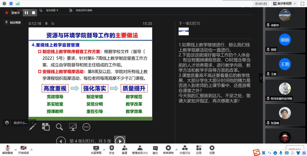 会上,校督导员杨剑婷老师分享《应用型高校评价改革与内部质量保障体系建设专题培训会》的学习成果,资环学院督导组组长邹海明分享学院督导工作创新措施,给其他二级学院督导工作提供了非常重要的参考价值和借鉴意义。本次督导工作会议的召开,明确了下一步重点工作及其要求,对学校线上、线下教学督导工作具有重要的指导意义。(特约通讯员:马万征 摄影:卫兰兰 审核:程斌 编辑:马万征)