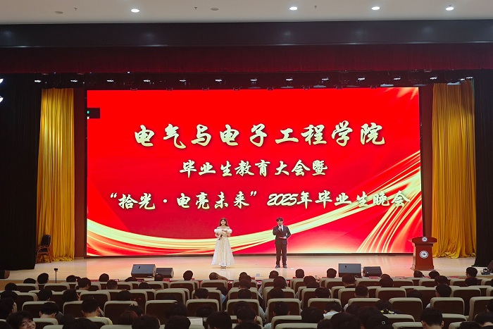 6月17日晚,电气与电子工程学院于东辅楼报告厅隆重举办“拾光·电亮未来”2025年毕业生晚会。学院党政领导、各系室负责人、专职辅导员老师以及2025届毕业生、非毕业生学生代表共同出席。晚会共分“拾光成炬·十载星辉”“电燃希望·智启新章”上下两个篇章。