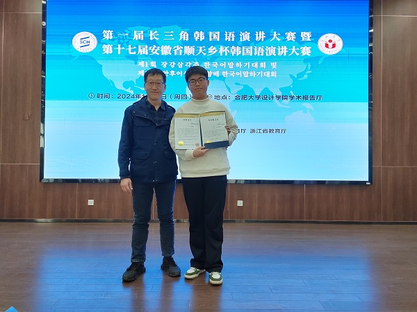 12月5日,由安徽省教育厅主办,上海市教育委员会、江苏省教育厅、浙江省教育厅指导的第一届长三角韩国语演讲大赛暨第十七届安徽省顺天乡杯韩国语演讲大赛在合肥大学顺利举办。合肥大学党委副书记、校长任永,顺天乡大学副校长金龙夏,安徽省教育厅外事处处长姚德勇,合肥大学国际交流合作处处长张慧等出席大赛开幕式。来自南京大学、上海外国语大学、杭州师范大学、安徽师范大学等22所高校25位选手入围,我校1人获得参赛资格。