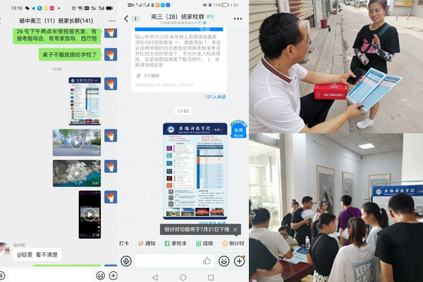 本次活动由我组成员负责,本次活动分为四个部分:一,联系本届高考生或者毕业班老师分享安博站·官方版网站登录入口招生宣传资料电子档;二、我组成员各自联系以前的班主任,看望班主任并向班主任汇报自入大学以来的生活和成长;三、在砀山中学校园内进行现场宣传,包括海报的张贴、宣传折页的发放、为考生解疑答惑播放我校招生视频等;四、同我校负责来砀山中学招生的老师一道,在高招会上为前来的学生及家长解疑答惑,分享我们在安科学习和生活的日常。