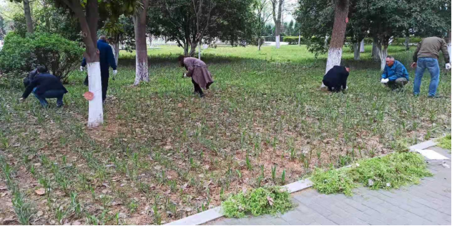 后勤保障部副主任柳卫国、谷凯带领后勤保障部党支部全体党员深入中办公楼西南角校园草坪和绿化带,带领大家亲手拔出杂草,捡拾草坪中的石块等废弃物,为绿化美化校园环境出一份力,获得了路过师生的一致点赞和好评。