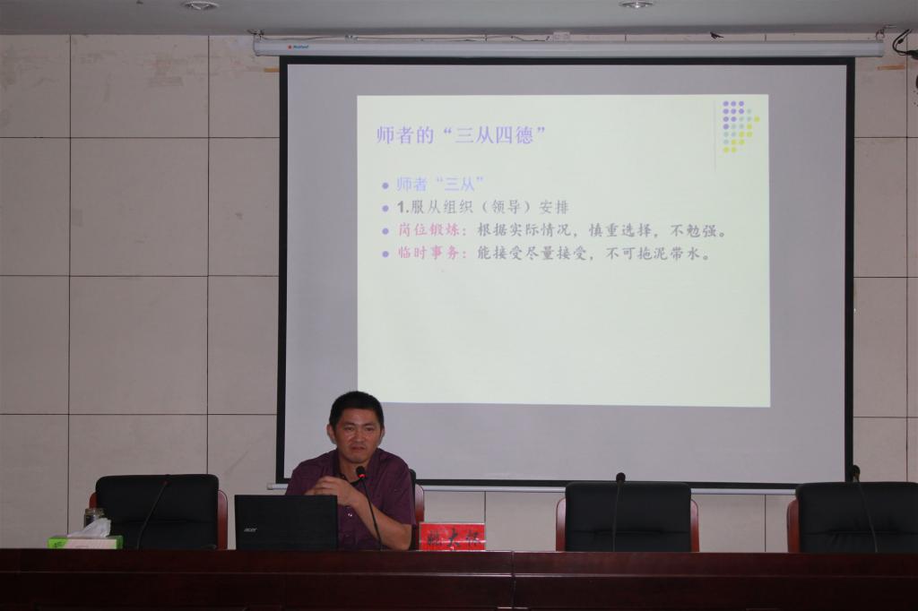 姚大怀用诙谐幽默的语言,有针对性地介绍了加强自身师德建设的有效途径和方法,并形象的诠释为师者的“三从四德”:即服从组织(领导)安排、听从合理建议、遵从初心召唤;从教之德、为学之德、做人之德、处世之德。