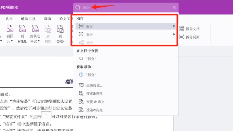 点击最顶部的“搜索”框,输入想要的动作,如“拆分“,就会在下拉列表中出现相关的动作。