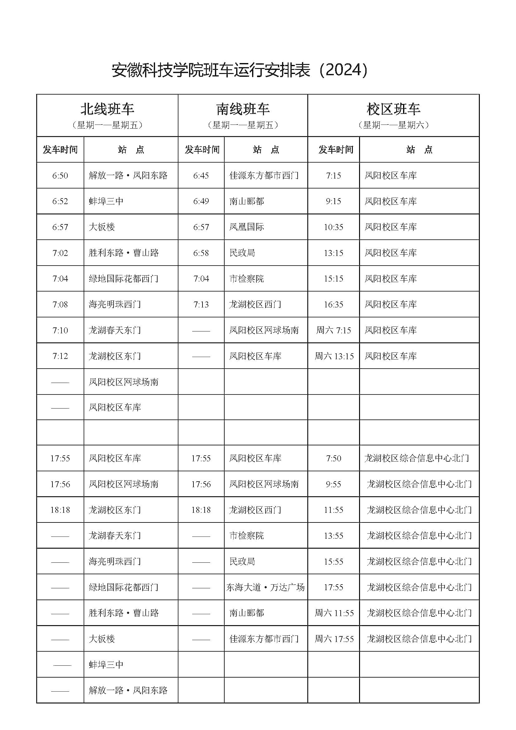 2.校区班车运行时间为:凤阳校区车库7:00、9:15、10:35、13:00、15:15、16:35;龙湖校区综合信息中心北门7:50、10:00、12:15、13:55、16:00、18:15。