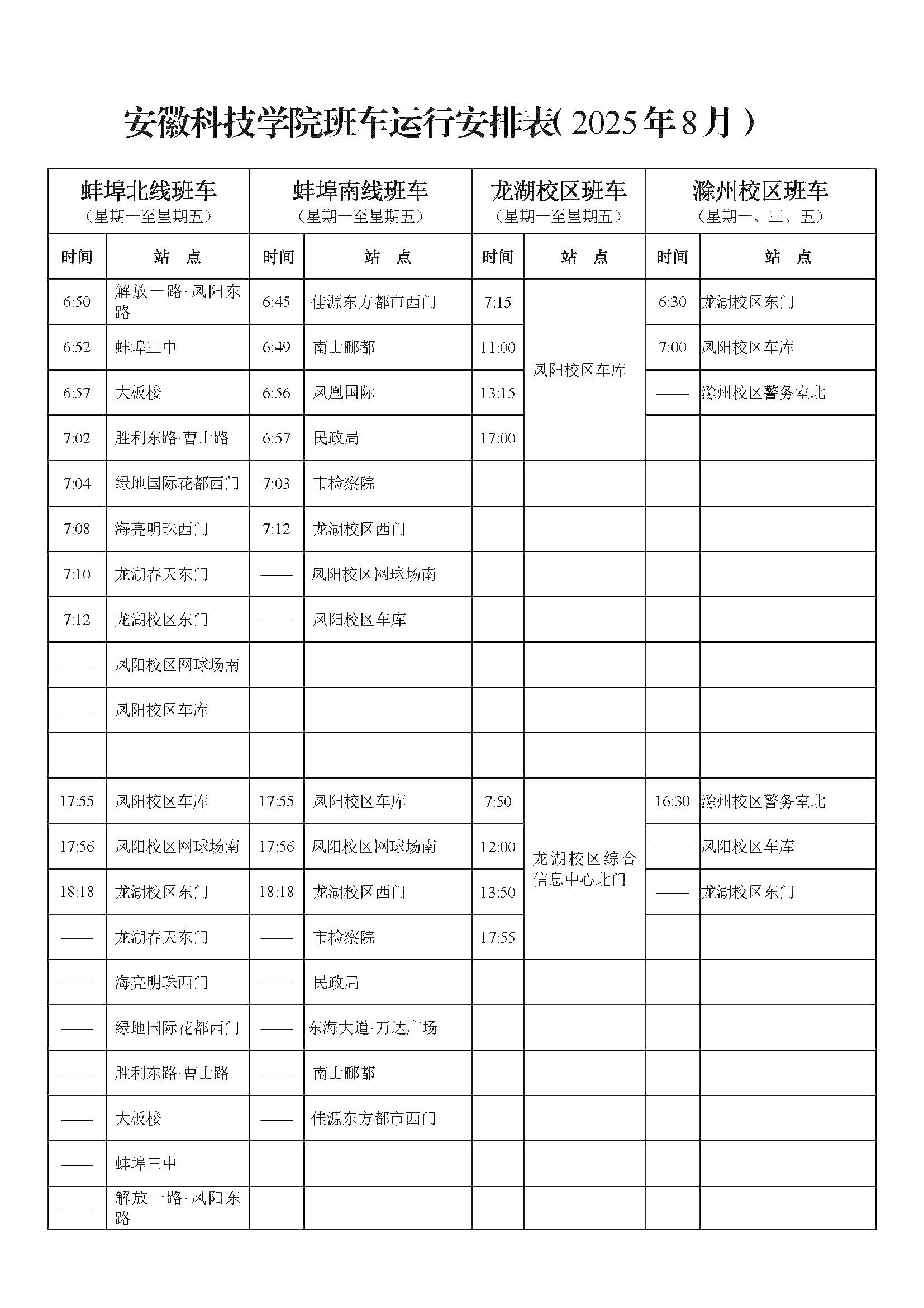 (二)滁州校区班车各站点按《安博站·官方版网站登录入口班车运行安排表(2025年8月)》早晚各推迟30分钟发车;