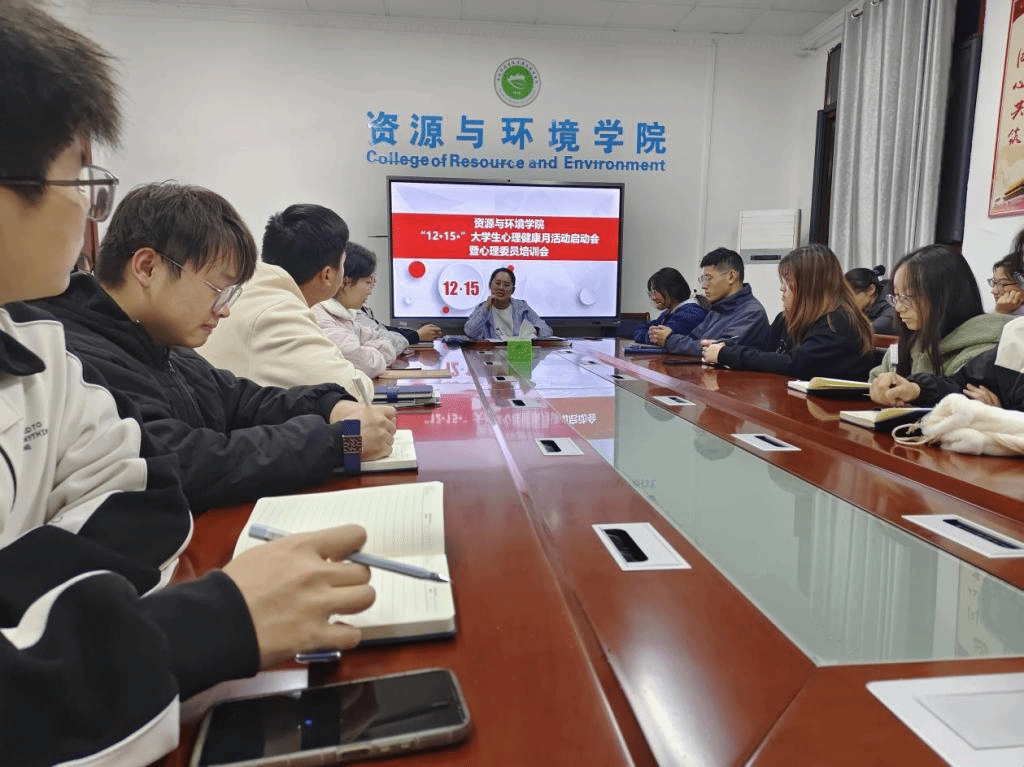 为全面部署“12·15”大学生心理健康月活动,进一步提升心理委员工作技能水平,11月19日晚,资源与环境学院于学院会议室召开“12·15”大学生心理健康月活动启动会暨心理委员培训会,会议由学院心理辅导老师杨小晗主持,全体心理委员参加。