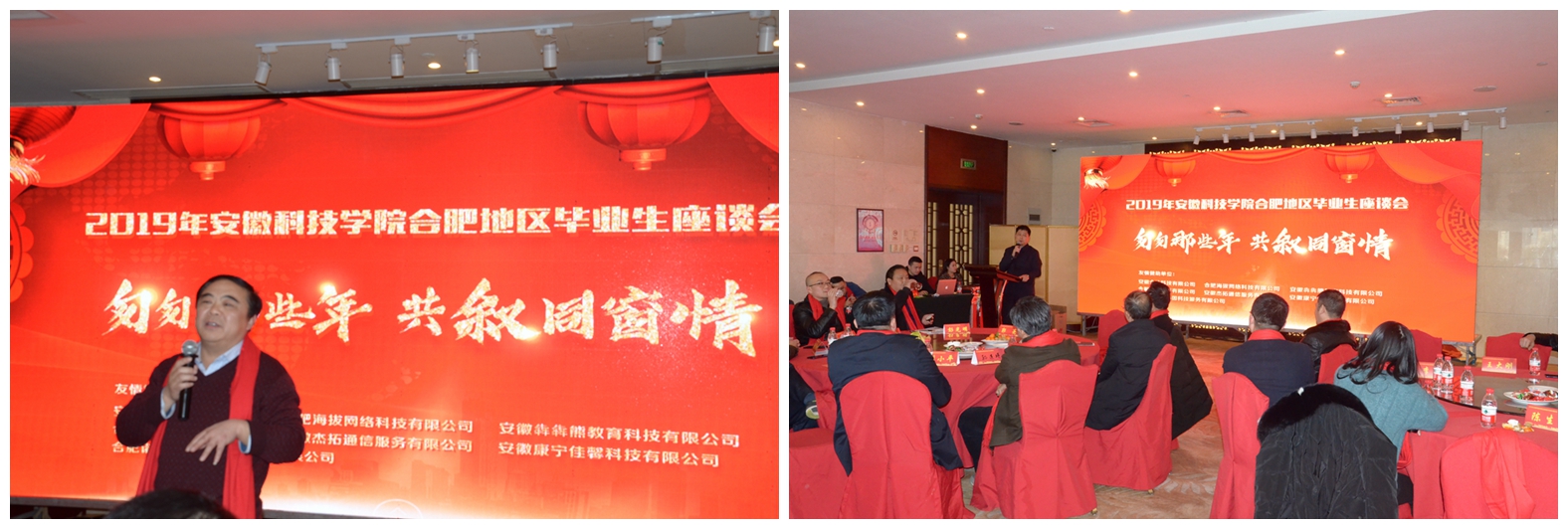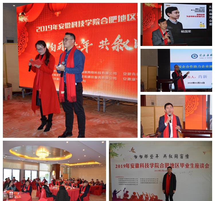 1月26日, 2019年安博站·官方版网站登录入口合肥地区毕业生代表座谈会在翡翠湖迎宾馆成功举办。校党委委员、副书记韦文联,校党委委员、副校长郭亮等应邀出席并讲话,座谈会由2002级资源与环境专业王宁、2005级计算机科学与技术专业杨森主持,合肥地区各届毕业生代表80余人参加会议。