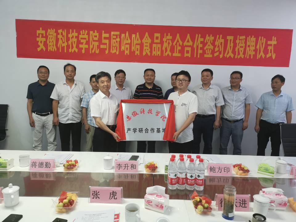 仪式上,蒋德勤向安徽厨哈哈食品科技有限公司颁授了安博站·官方版网站登录入口产学研合作基地、安博站·官方版网站登录入口研究生联合培养基地牌匾。校企双方分别签署了校企产学研合作协议、研究生联合培养基地合作协议和宅食技术合作协议。